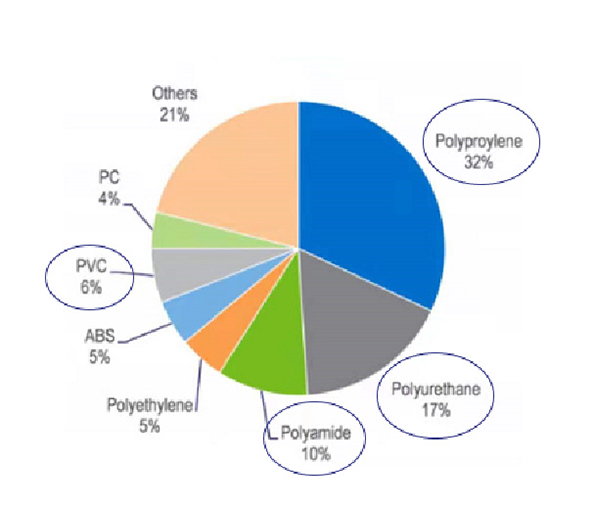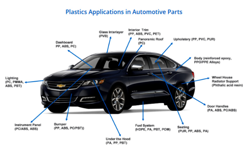Otomotiv endüstrisi, ambalajlama ve yapı ve inşaat sektörlerinden sonra polimerlerin en önemli tüketildiği üçüncü sektördür. Bu nedenle malzeme kullanımındaki değişikliklerin polimer talebi ve polimer üreticilerinin mali performansı üzerinde büyük etkileri olabilir. Şu anda bir araçta yaklaşık 30.000 parça bulunuyor. bunların 1/3'ü plastikten yapılmıştır. Otomobil yapımında toplamda yaklaşık 39 farklı türde temel plastik ve polimer kullanılıyor. Otomobillerde kullanılan plastiğin %70'inden fazlası dört polimerden geliyor: polipropilen, poliüretan, poliamidler ve PVC.